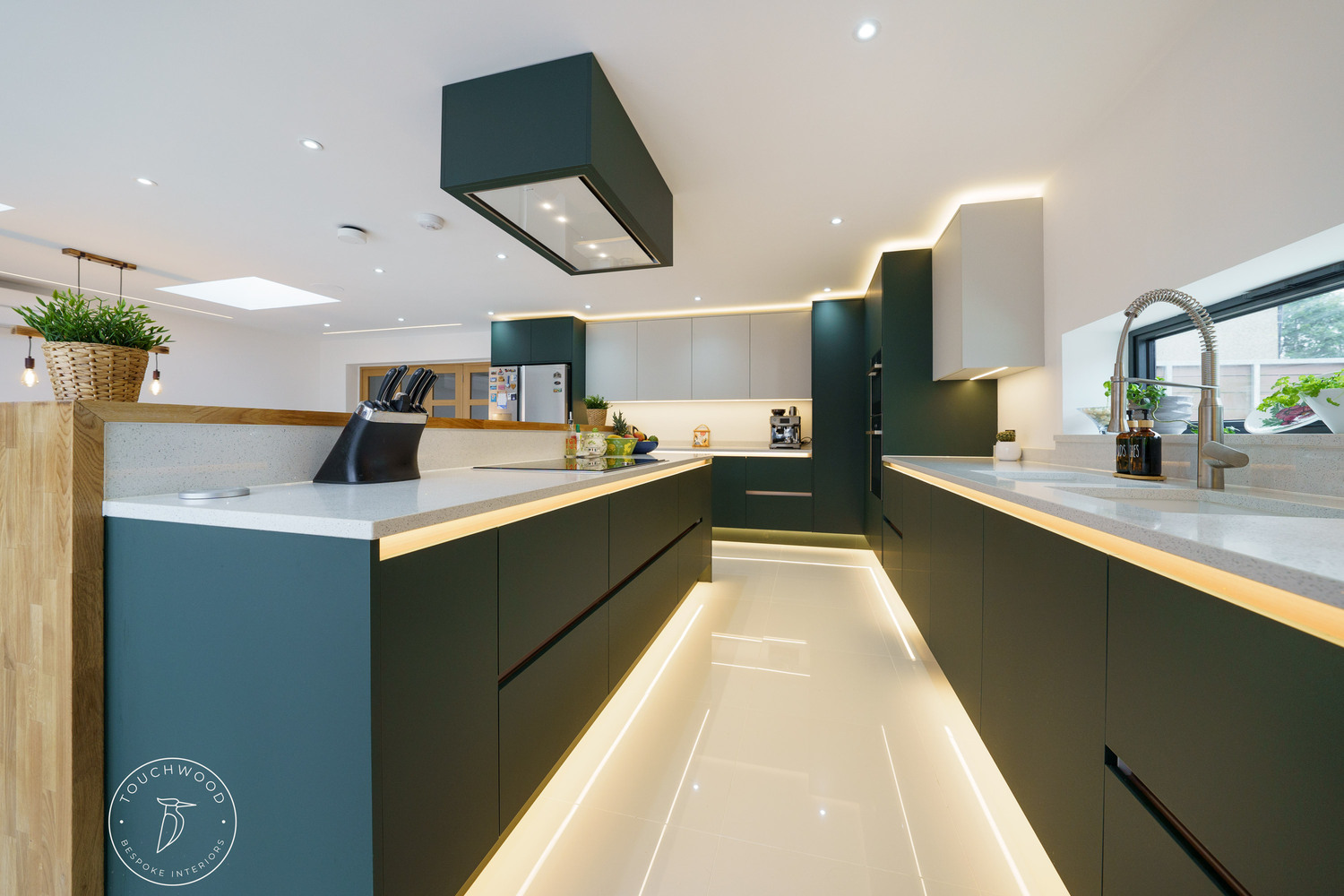 Matt Green and Light Grey Kitchen with Copper Accents, Quartz Tops and Oak Breakfast Bar
